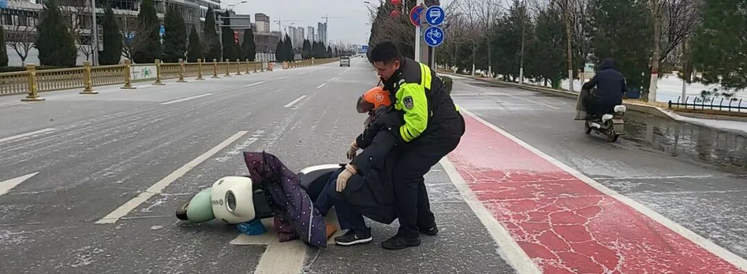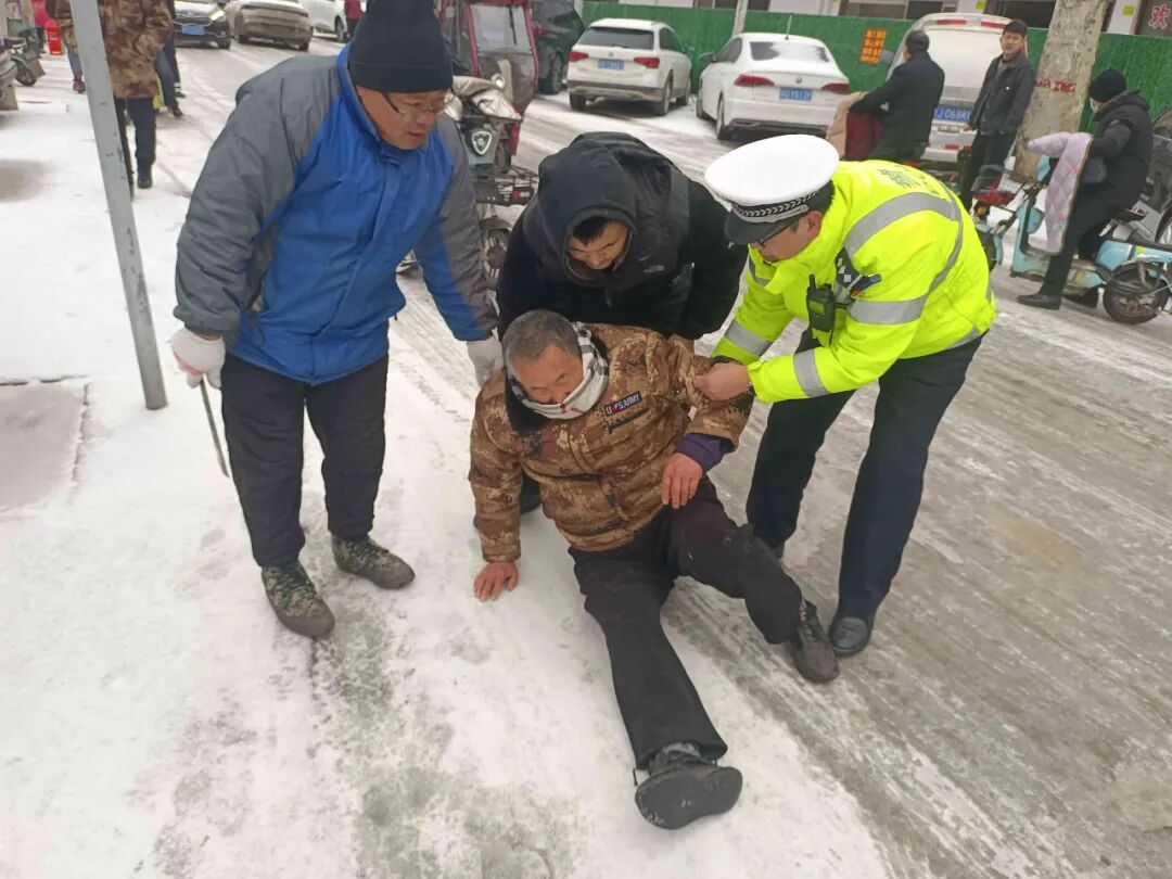 2024年2月21日早,滕州交警在塔寺路洪盛楼路口执勤,一名过路行人,因路面结冰导致滑倒,民警发现后及时帮助,将行人搀扶到路边。