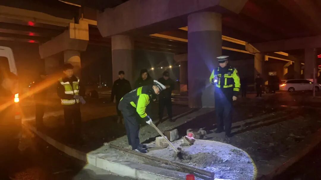 ▲高新交警联合综合执法局对世纪大道复兴路口结冰路段进行封控。