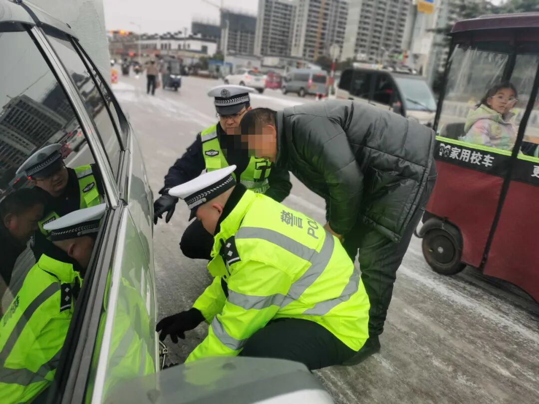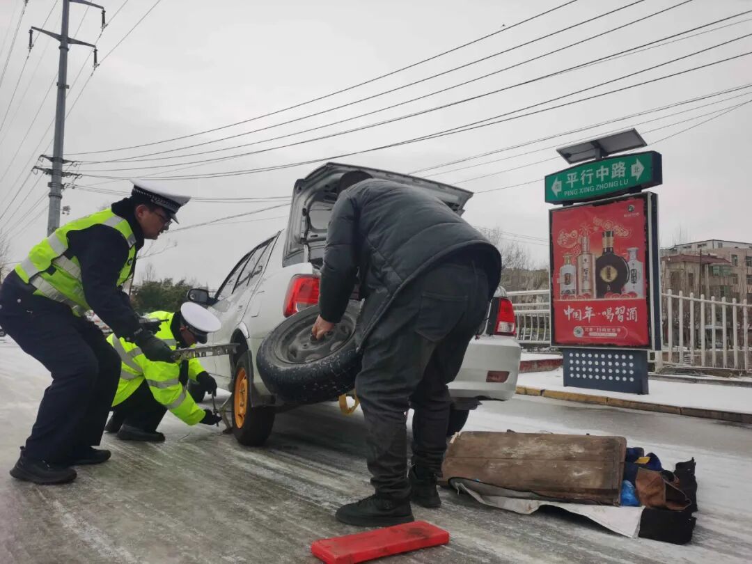 经询问得知,驾驶人在行驶过程中,因雨雪天气,路面湿滑,导致车辆行驶过程中急刹爆胎,无法行驶,虽然车内存有千斤顶和备胎,但驾驶人不会使用,只能站在原地干着急。了解情况后,执勤民警“撸起袖子”,帮助驾驶人更换备用轮胎。不到10分钟,执勤民警娴熟地将轮胎换好,帮助驾驶人摆脱困境,及时消除道路安全隐患,驾驶人对热心的交警连声道谢。