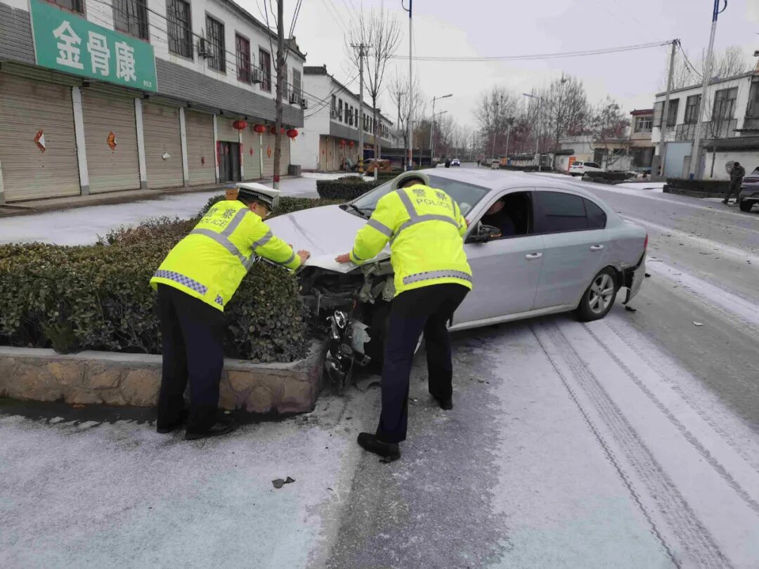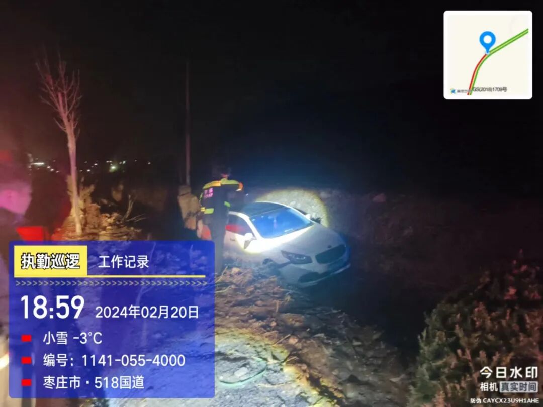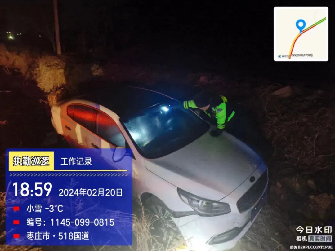 2月21日早,滕州交警在322省道巡逻发现一辆车辆打滑与路边花丛发生碰撞的车辆,值班人员立即前往救助。