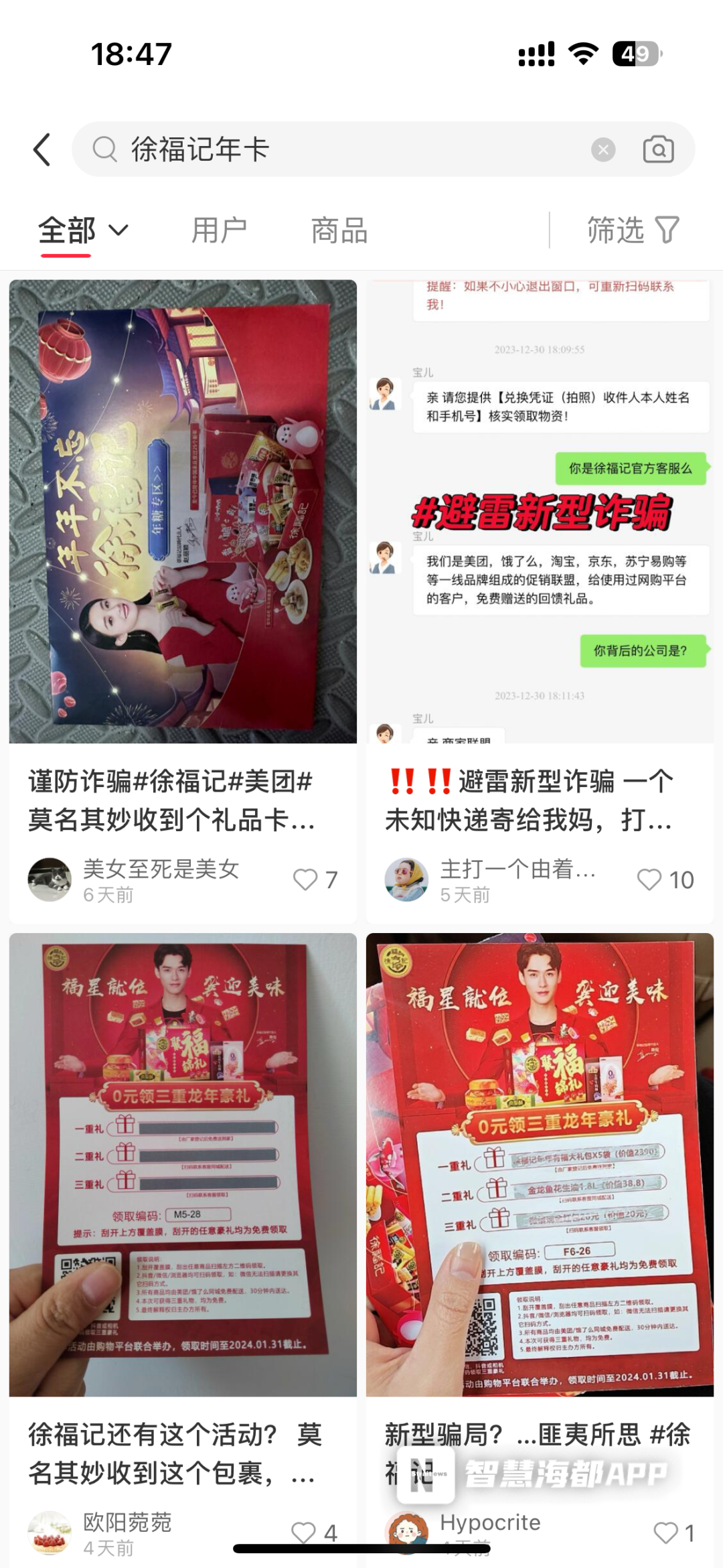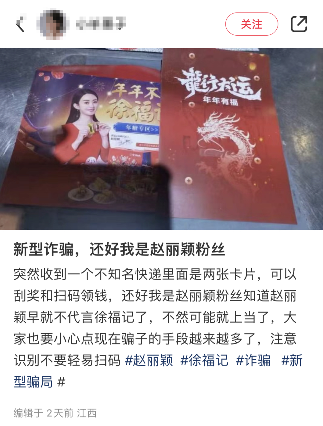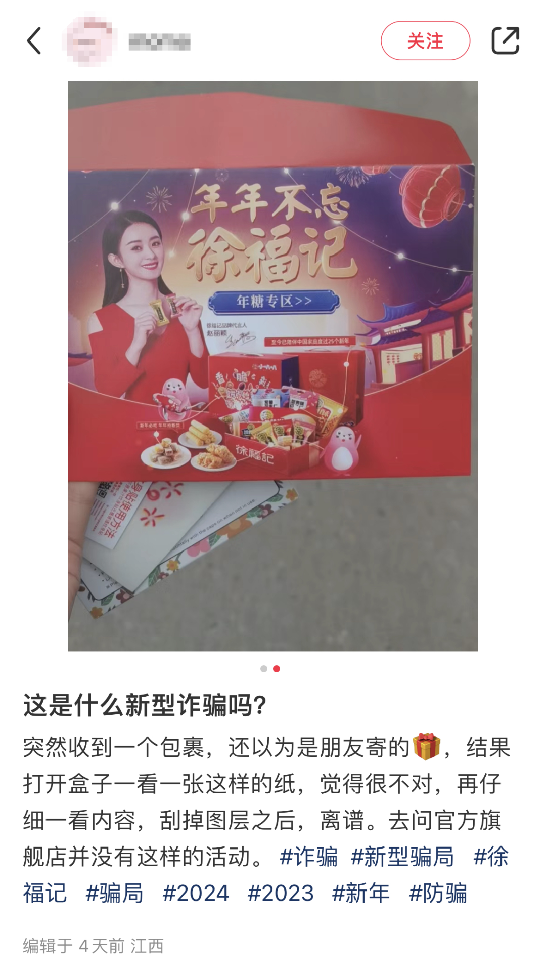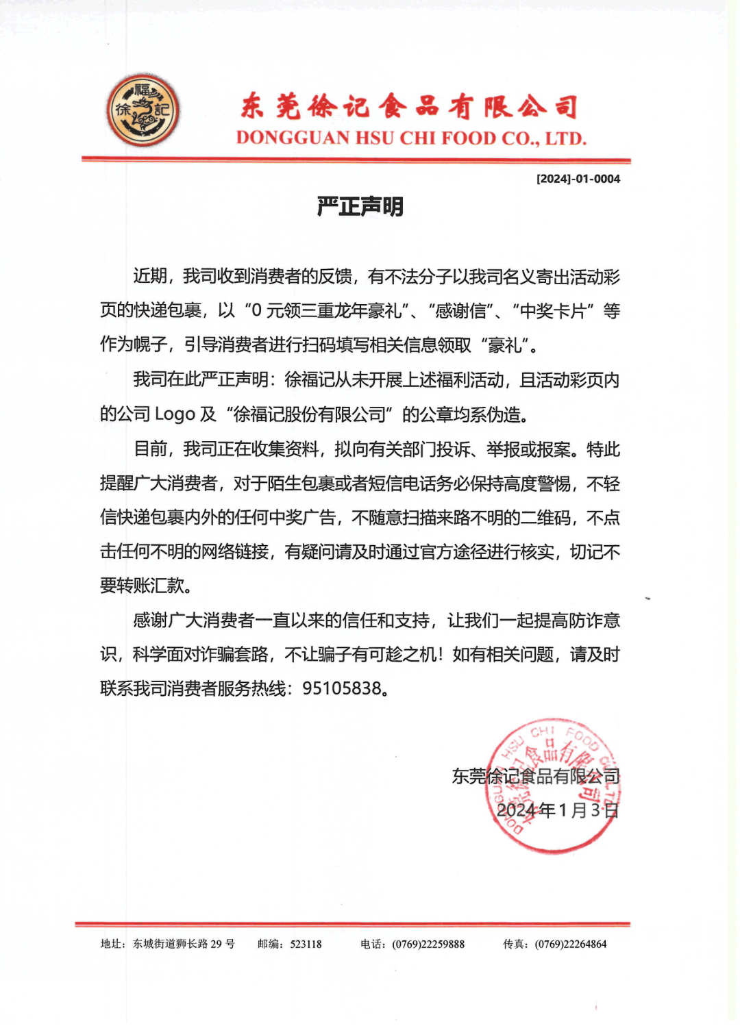 记者致电“徐福记”,相关工作人员表示,目前已收到多位消费者反映该情况,公司未开展上述福利活动,系不法分子以“徐福记”名义寄出活动彩页的快递包裹。目前公司已经在官网、社媒平台上发布“严正声明”,提醒消费者保持警惕,不要轻易上当受骗。