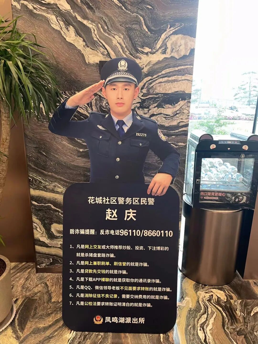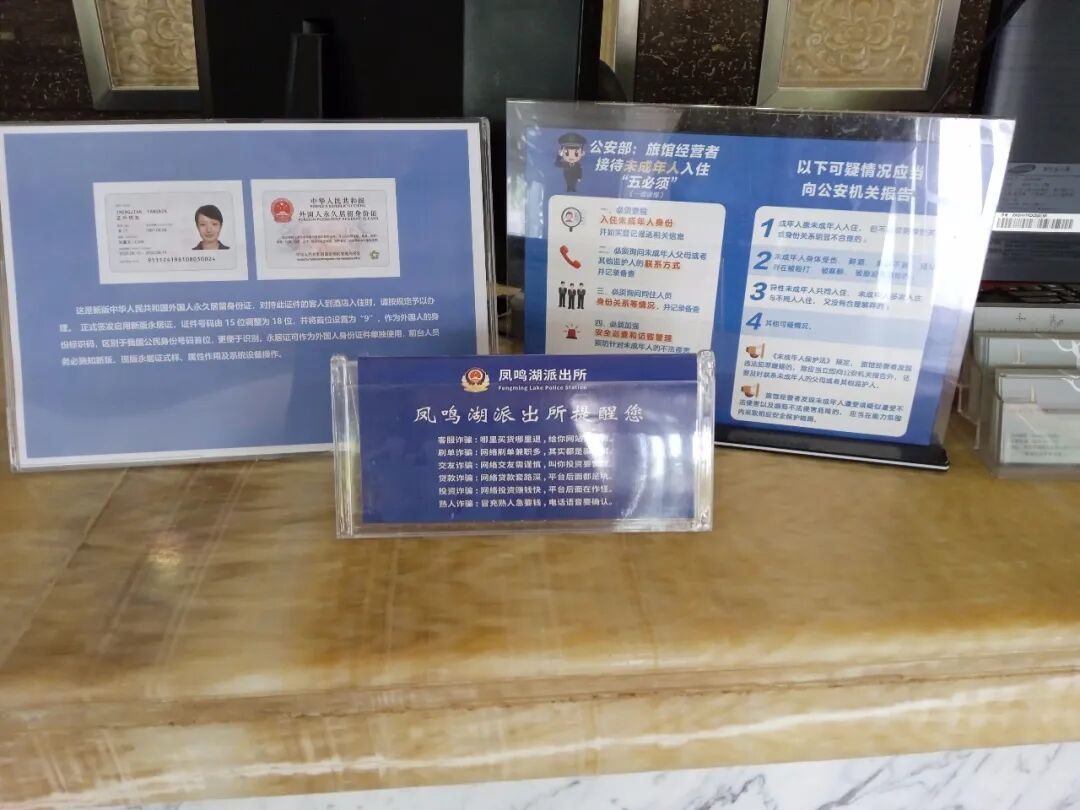 为了让旅客“多看一眼,多记一点,多防一步”,凤鸣湖派出所在辖区酒店、宾馆醒目位置设置了反诈宣传角,投放“反诈人形立牌”,摆放反诈宣传桌牌。