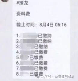 流程看似正规,数额不大,导致9名家长在40分钟内扫码支付,共被骗4000余元。骗子甚至将已缴费家长拉入小群企图进一步诈骗。