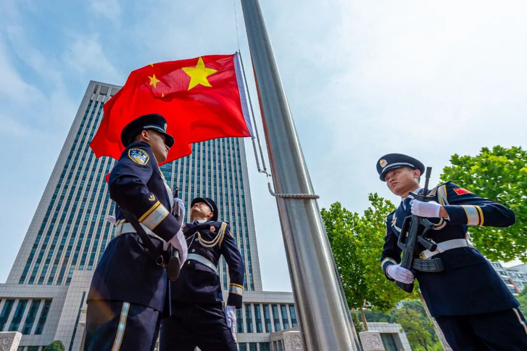 9时30分,升旗仪式正式开始。护旗队员迈着铿锵有力的步伐,昂首挺胸、意气风发,护卫国旗入场。伴随着雄壮的《义勇军进行曲》,鲜艳的五星红旗冉冉升起,现场全体民警警容严整,面向国旗庄严敬礼,表达对党、对国家、对公安事业的忠诚和热爱。