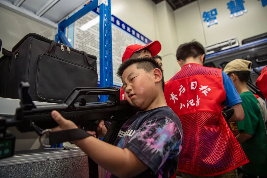 “哇~让我也摸一摸!” 小朋友们惊叹连连,在特警队员照看下,拿着枪,摆着各种端枪、瞄准的姿势拍照。