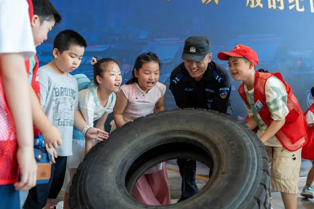 翻轮胎比赛中,特警队员与小朋友们来了一场硬碰硬的“较量”,呐喊声、加油声此起彼伏,激励着每一名“选手”,大家激情角逐、奋力冲向终点。