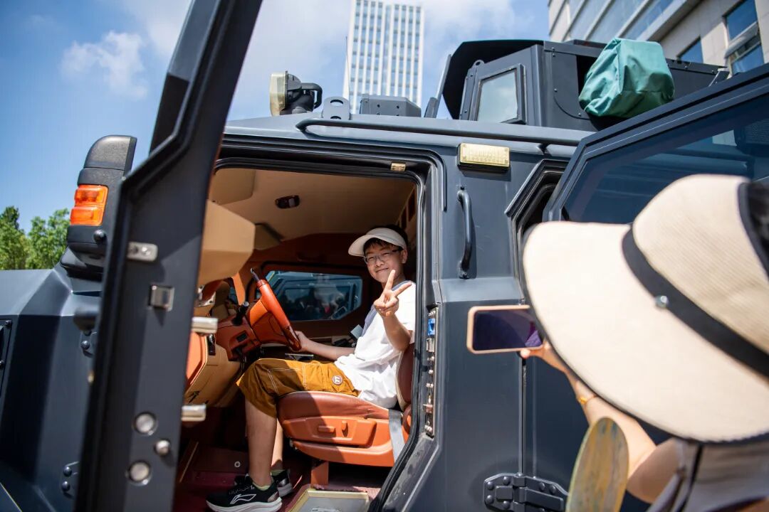 “这装甲车真酷啊!我想上去拍张照片。”“坐上驾驶位,我也是威风凛凛的小特警!”小朋友们参观了暴龙装甲车、通信指挥车等特种车辆,在特警队员的保护下,纷纷登车过了一把“特警瘾”。