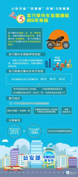 此次改革,公安部进一步扩大机动车全国“通检”范围,推行摩托车跨省异地检验,同时推行注册登记6年以内的摩托车免予检验,切实方便群众驾驶摩托车出行。