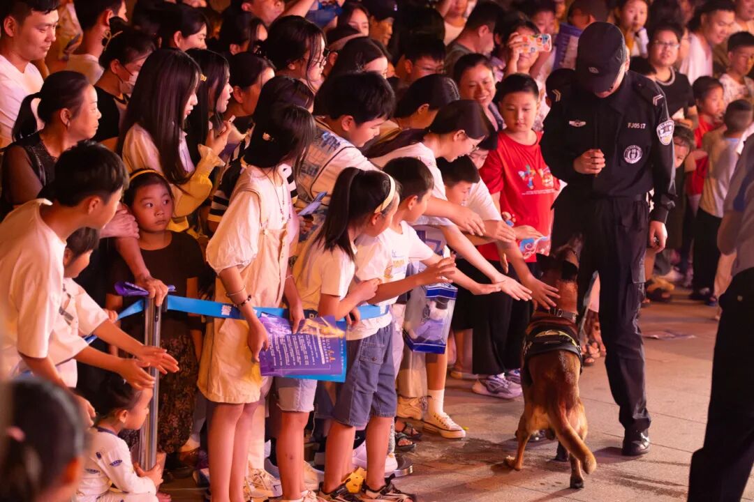 ▲“汪汪队”一出场,便吸引了大家的目光。小朋友们争相和警犬合影,对警犬爱不释手,摸了又摸。