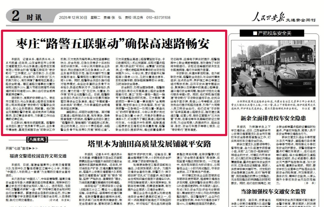 12月30日,人民公安报以《“路警五联驱动”确保高速路畅安》为题,报道了近年来,枣庄市公安局交通管理支队与山东高速枣庄发展有限公司共同打造的“路警五联驱动‘枣安畅行’”工作模式。这一模式相继获评“2024全国高速公路运营管理代表案例”“2025人民交通大会典型案例”等荣誉。这既是对创新实践的充分认可,更彰显了枣庄公安现代交通治理的精细化水平和协同高效的作战能力。