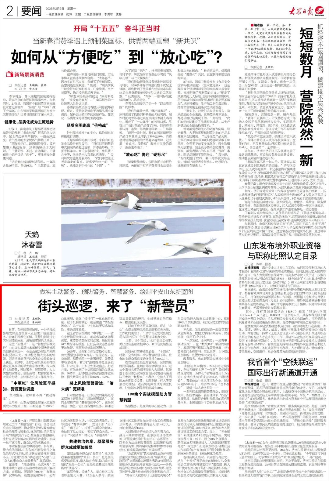 △2月9日,大众日报要闻版刊发《做实主动警务、预防警务、智慧警务!绘制平安山东新蓝图》。