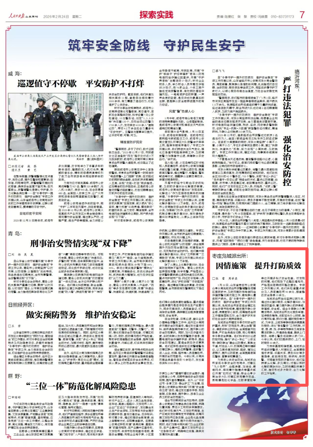 2月24日,人民公安报以《因情施策 提升打防质效》为题,报道了自“冬季守护”工作开展以来,枣庄市公安局山亭分局凫城派出所锚定提升群众安全感核心目标,统筹推进各项工作措施落地见效,全力维护岁末年初社会治安大局持续稳定。