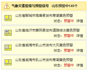 截至16:10,山东全省有149个暴雪、寒潮、道路结冰、大风预警正在生效↓
