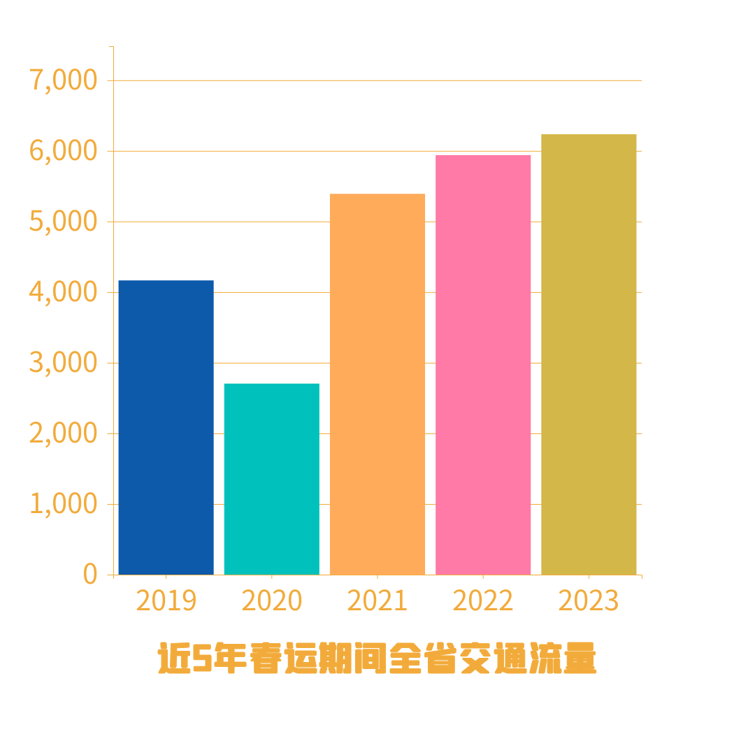 从近5年春运期间全省交通流量情况看,2019年至2023年车流量分别达到4166万车次、2705万车次、5392万车次、5940万车次、6236万车次,除2020年受疫情防控影响出现大幅下降外,其余年份均呈逐年上升趋势。