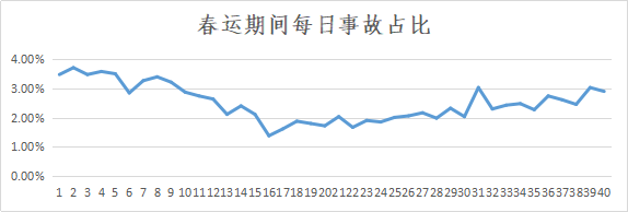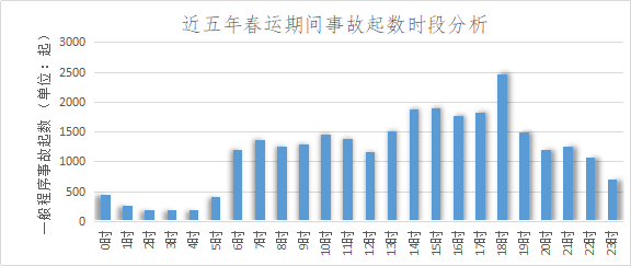 从事故时段分布看,春运期间每日18时、15时、14时发生交通事故最多,是交通事故风险最高的时段。