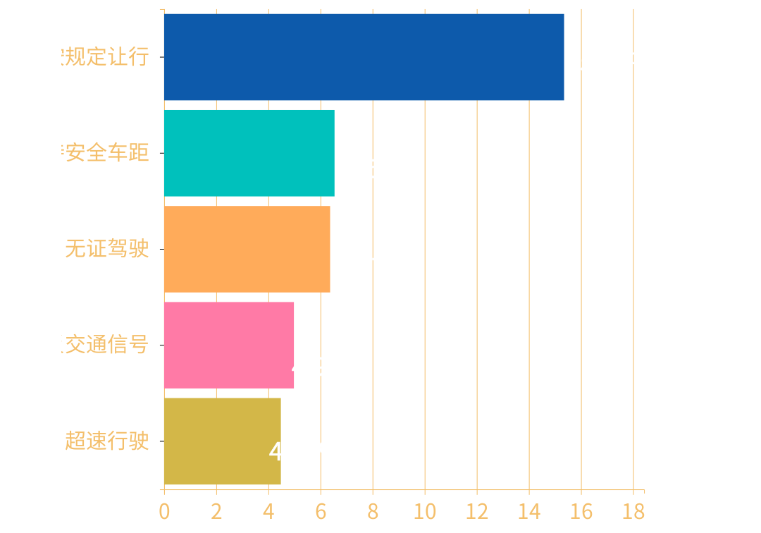 从事故的主要成因分析,未按规定让行、不按规定与前车保持必要的安全、无证驾驶、违反交通信号、超速行驶等交通违法导致事故比例高,分别占总数的15.35%、6.54%、6.37%、4.98%、4.48%;酒后驾驶、逆行、超速行驶占比分别高出平时0.28个百分点、0.25个百分点、0.2个百分点。春运期间,机动车驾驶人违法肇事比例最高,驾驶人酒后驾驶、逆行、超速行驶等肇事风险上升。