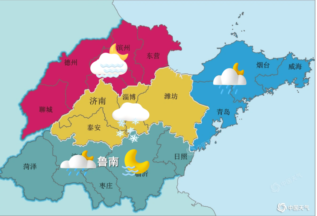 根据近五年春运气象综合分析,鲁西北地区多雾霾天气,鲁中地区多雪天,鲁南地区多雨雾天气,半岛地区多雨夹雪天气。