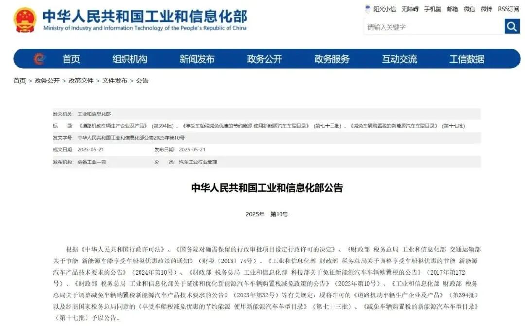 根据《中华人民共和国行政许可法》、《国务院对确需保留的行政审批项目设定行政许可的决定》、《财政部 税务总局 工业和信息化部 交通运输部关于节能 新能源车船享受车船税优惠政策的通知》(财税〔2018〕74号)、《工业和信息化部 财政部 税务总局关于调整享受车船税优惠的节能 新能源汽车产品技术要求的公告》(2024年第10号)、《财政部 税务总局 工业和信息化部 科技部关于免征新能源汽车车辆购置税的公告》(2017年第172号)、《财政部 税务总局 工业和信息化部关于延续和优化新能源汽车车辆购置税减免政策的公告》(2023年第10号)、《工业和信息化部 财政部 税务总局关于调整减免车辆购置税新能源汽车产品技术要求的公告》(2023年第32号)等有关规定,现将许可的《道路机动车辆生产企业及产品》(第394批)以及经商国家税务总局同意的《享受车船税减免优惠的节约能源 使用新能源汽车车型目录》(第七十三批)、《减免车辆购置税的新能源汽车车型目录》(第十七批)予以公告。
