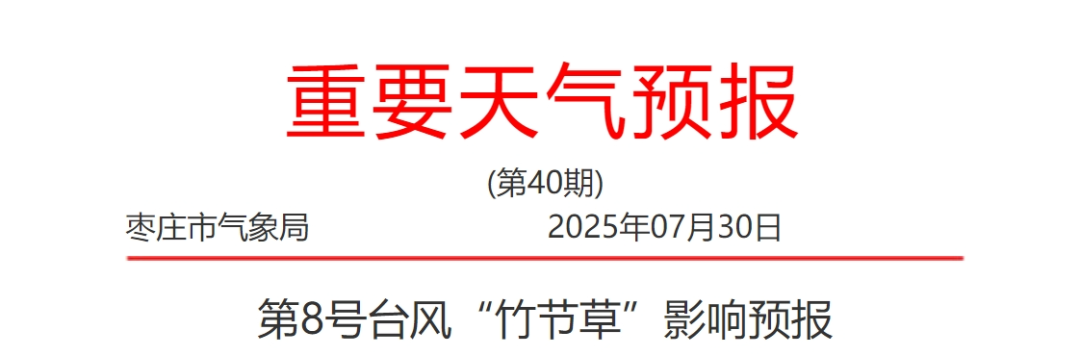 枣庄气象部门将密切监测台风“竹节草”的最新动向及对枣庄市的风雨影响,及时发布预报预警信息。
