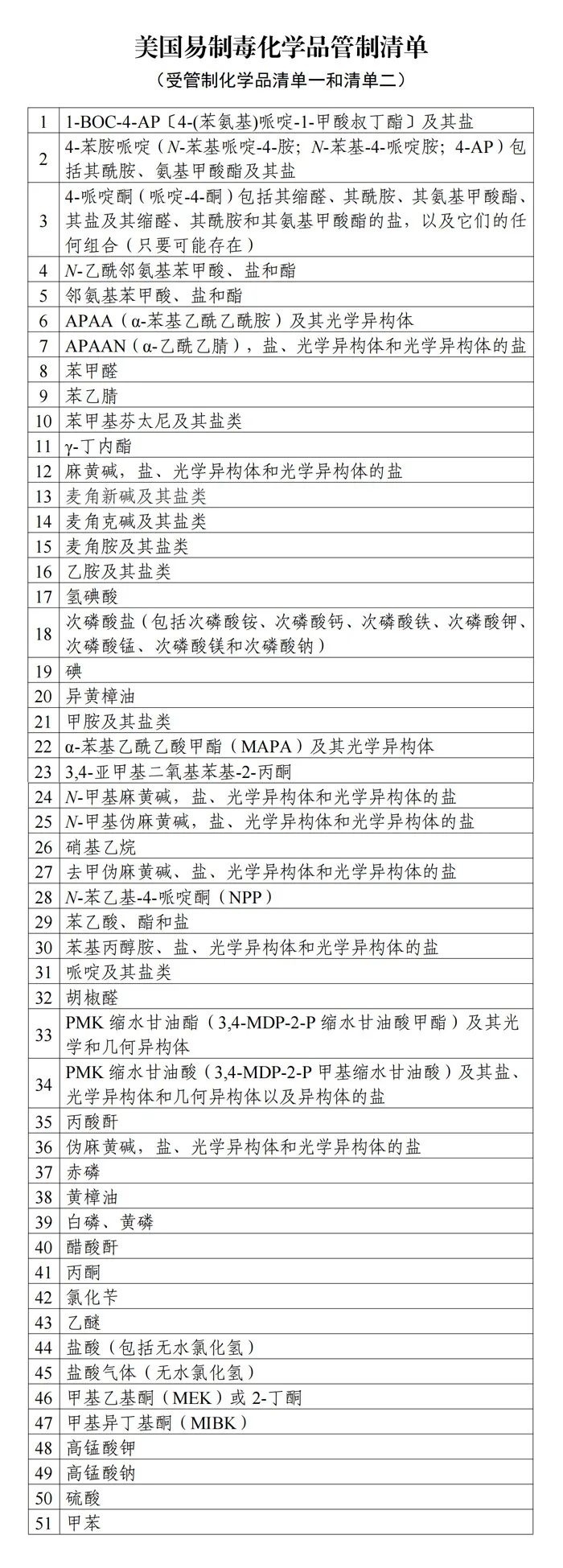 为依法加强对麻醉药品和精神药品、制毒物品的管控,保护我国企业和公民的合法权益,提醒相关企业和广大群众在从事经营活动时遵守国家相关法律法规规定,现将有关事项通告如下:1.根据《中华人民共和国刑法》第350条之规定,严禁任何组织和个人非法生产、买卖、运输醋酸酐、乙醚、三氯甲烷或其他用于制造毒品的原料、配剂,或者携带上述物品进出境。严禁任何组织和个人明知他人制造毒品而为其生产、买卖、运输前款规定的物品。2.根据《中华人民共和国刑法》相关规定,明知他人将使用某种非列管化学品及设备非法制造麻醉药品或精神药品而仍然为其生产、销售、运输或进出口非列管化学品及设备的,按照制造毒品犯罪共犯论处。3.根据《中华人民共和国禁毒法》第21条之规定,严禁任何组织和个人非法生产、买卖、运输、储存、提供、持有、使用麻醉药品、精神药品和易制毒化学品。4.根据《中华人民共和国海关法》相关规定,运输、携带、邮寄国家禁止或者限制进出境货物、物品或者依法应当缴纳税款的货物、物品进出境的,是走私行为,构成犯罪的,依法追究刑事责任;进出口货物、物品或者过境、转运货物向海关申报不实的,可以处以罚款,有违法所得的,没收违法所得。5.根据《易制毒化学品进出口管理规定》第47条之规定,严禁任何组织和个人未经许可或超出许可范围进出口易制毒化学品,严禁个人携带第一类易制毒化学品中的药品类易制毒化学品药品制剂和高锰酸钾以外的易制毒化学品进出境。个人携带第一类易制毒化学品中的药品类易制毒化学品药品制剂和高锰酸钾进出境的,应当以自用且数量合理为限,并接受海关监管。6.邮政、快递企业和物流企业发现非法邮寄、运输、夹带疑似麻醉药品或精神药品、易制毒化学品等制毒原料或配剂的,应当立即向公安机关或者海关报告,并配合公安机关或者海关进行调查。邮政、快递企业和物流企业应当如实记录或者保存上述信息。7.明知某种非列管化学品已在有关国家被列为毒品或易制毒化学品进行管制,仍然向该国销售、运输、出口的,将可能面临该国执法部门的刑事指控或制裁。8.涉及美国管制化学品(品种详见附件)的生产、经营、进出口企业和个人应谨慎对待来自美国和墨西哥等相关国家的订单,警惕出口物品被用于制造毒品和可能面临的“长臂管辖”甚至“钓鱼执法”的风险。9.压片机设备及模具的生产、经营、进出口企业和个人应谨慎对待来自美国和墨西哥的订单,防止流入非法渠道,防范被“钓鱼执法”或制裁风险。10.相关企业和个人要增强法律意识,对既有合法用途又可用于制毒的非列管化学品及相关设备,出口时应密切关注相关进口国特别是美国和墨西哥等高风险国家的法律法规,要求进口企业根据本国法律法规履行进口法律程序,防范法律风险。11.相关企业和个人在对外贸易中,如发现上述相关可疑订单,应及时报告所在地公安机关和相关主管部门,配合查清事实。12.相关企业和个人如遇外国执法部门“钓鱼执法”等不法侵害,可充分运用法律手段维护自身安全与合法权益。如在境外受到人身侵害,可通过我驻外使领馆寻求外交部门领事保护。