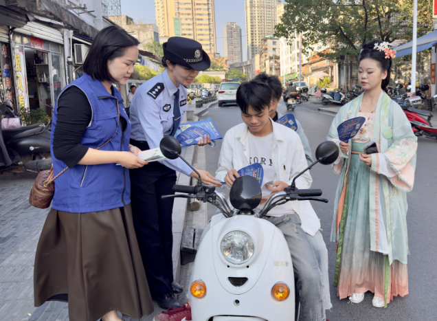 大家手持禁毒宣传标语,为沿途路人和商户派发禁毒知识小册子,宣传禁毒知识。大家还在广场会馆开展汉服走秀助禁毒活动,吸引了上千名群众驻足观看。