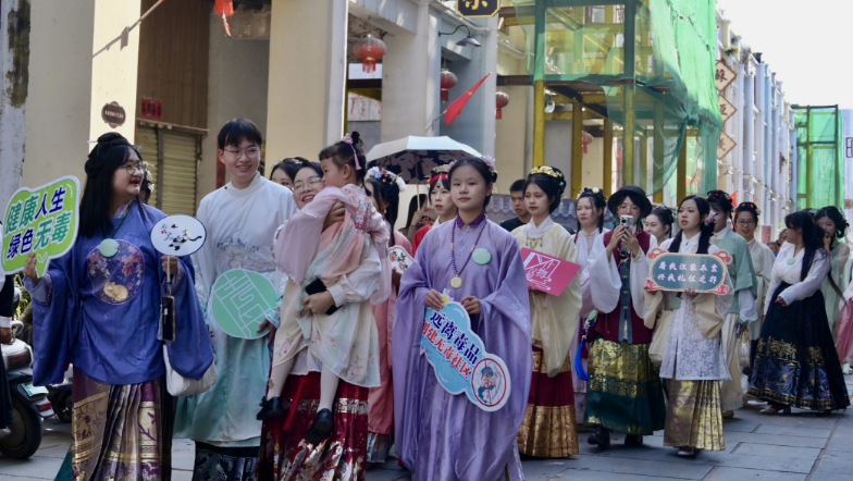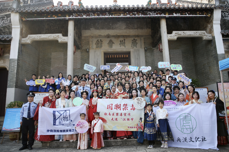 当天,近200名身穿汉服华衣的汉服爱好者与民警、禁毒社工从永福广场出发,途经占鳌巷、中山路与平南古渡,最终抵达宣传活动现场广州会馆。