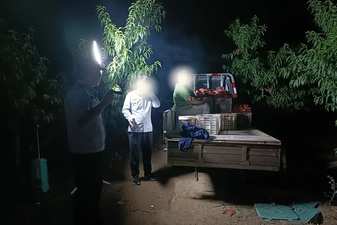 瓜果飘香季,也是各类盗窃案件的高发期,偷盗油桃和故意损毁果树的事件偶有发生。枣庄市公安局山亭分局冯卯派出所及时调整工作时间,将重心移到桃园周边,开启“亮灯110”夜间巡逻防控模式,因地制宜做强“夜间警务”。巡逻民辅警以驾警车和徒步巡的方式深入到乡间桃园周边的小路,切实做到“见警车、见警灯、见警察”,并和在果园夜间忙碌的果农们倾心交谈,互相交流安全防范措施,切实让果农安心、果商放心。