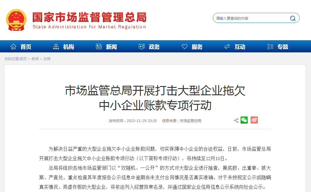 ●市场监管总局开展打击大型企业拖欠中小企业账款专项行动