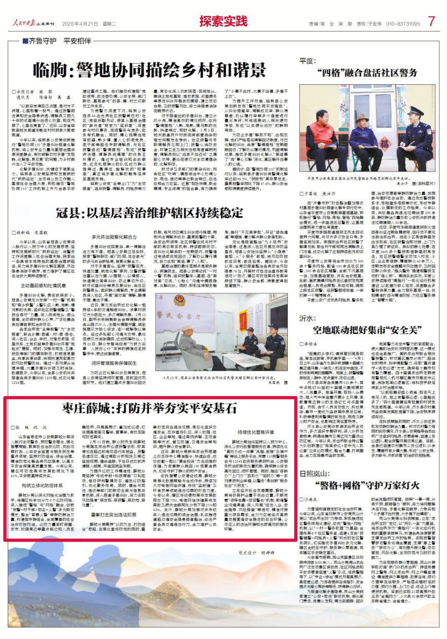 4月21日,人民公安报以《枣庄薛城:打防并举夯实平安基石》为题,报道了枣庄市公安局薛城分局深入践行主动警务、预防警务理念,坚持打防结合、综合治理,以高水平安全保障高质量发展。